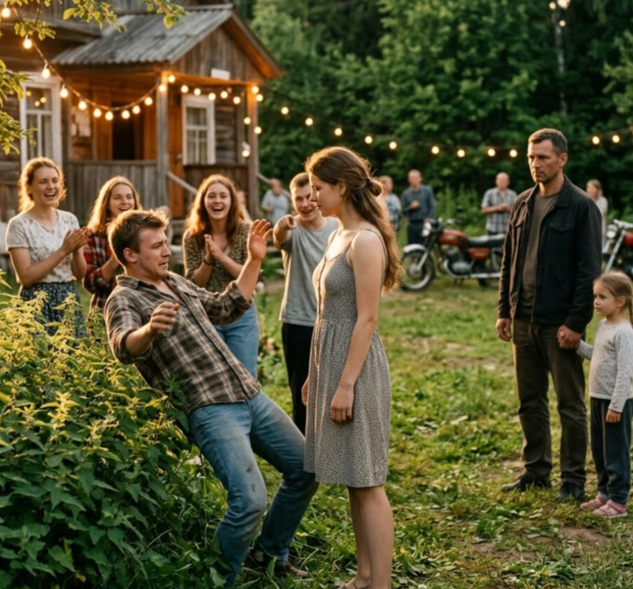 Глафира долго не раздумывает и толкает Мишку прямо в куст крапивы, куда он приземляется, как вертолет, смешно махнув руками. Тут же хохот у клуба, где собралась молодежь.